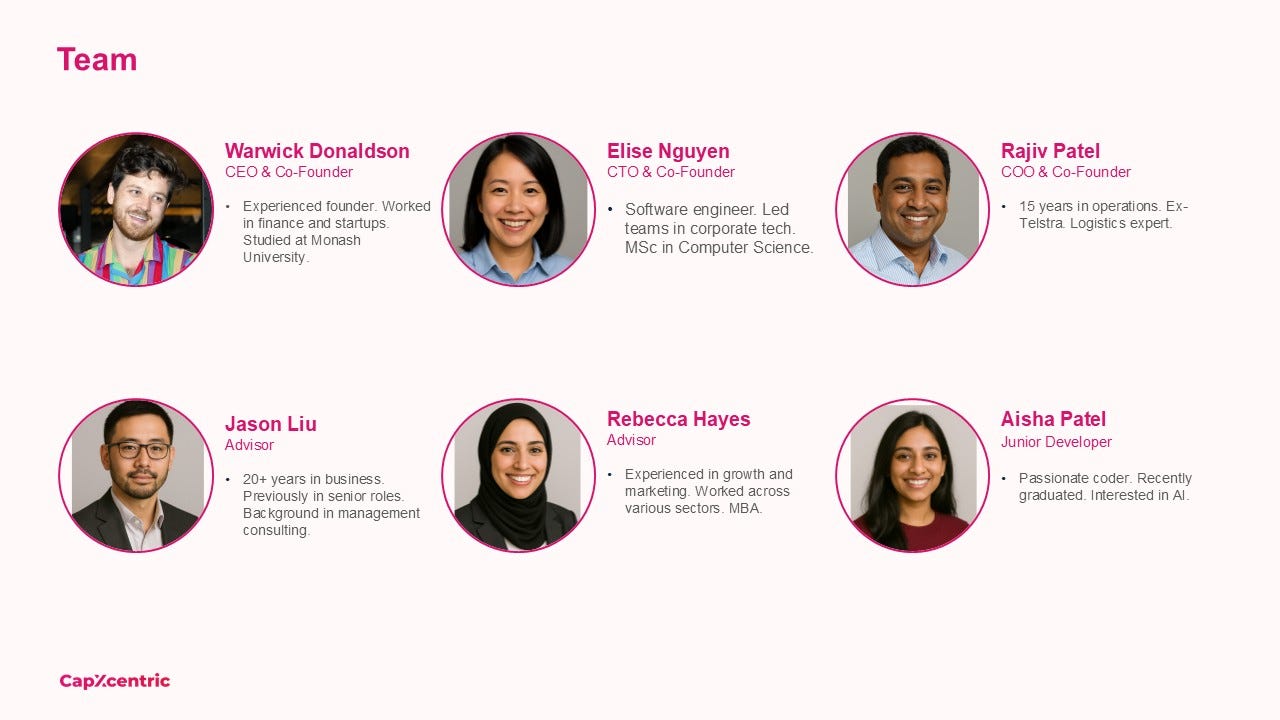 Below are three common team slides that I see in teaser pitch decks.