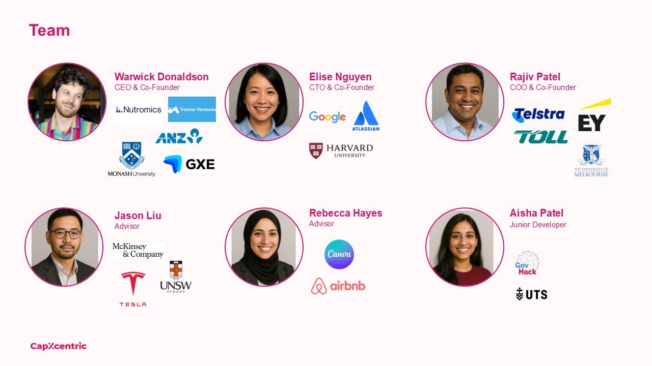 This is a poor slide → Only logos which say nothing! Working at Canva or studying at UNSW doesn’t mean you’re a great founder that will smash your competition and build a generational company.